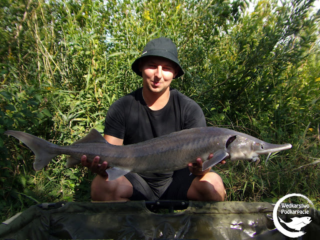 Miejsce w którym wieczorem mocno posypałem kukurydzą chwilę później przynosi branie. Zestaw składający się z kukurydzy, pianki pływającej i pływającej kukurydzy przynosi dziwne branie do naszego brzegu. Po zacięciu okazuje się, że ryba jest i rozpoczyna się jej hol ze sporego dystansu. Walka przebiega nadzwyczaj spokojnie, ale przy brzegu ryba wyskakuje nad wodę... Kolejny jesiotr. Do tej pory rybę holowałem spokojnie i uważnie ale po jej wyskoku delikatnie podkręcam hamulec, żeby ta zrobiła jak najmniej szumu dookoła nas. Szybko trafia do podbieraka, wypuszczamy ją i płyniemy łódką.